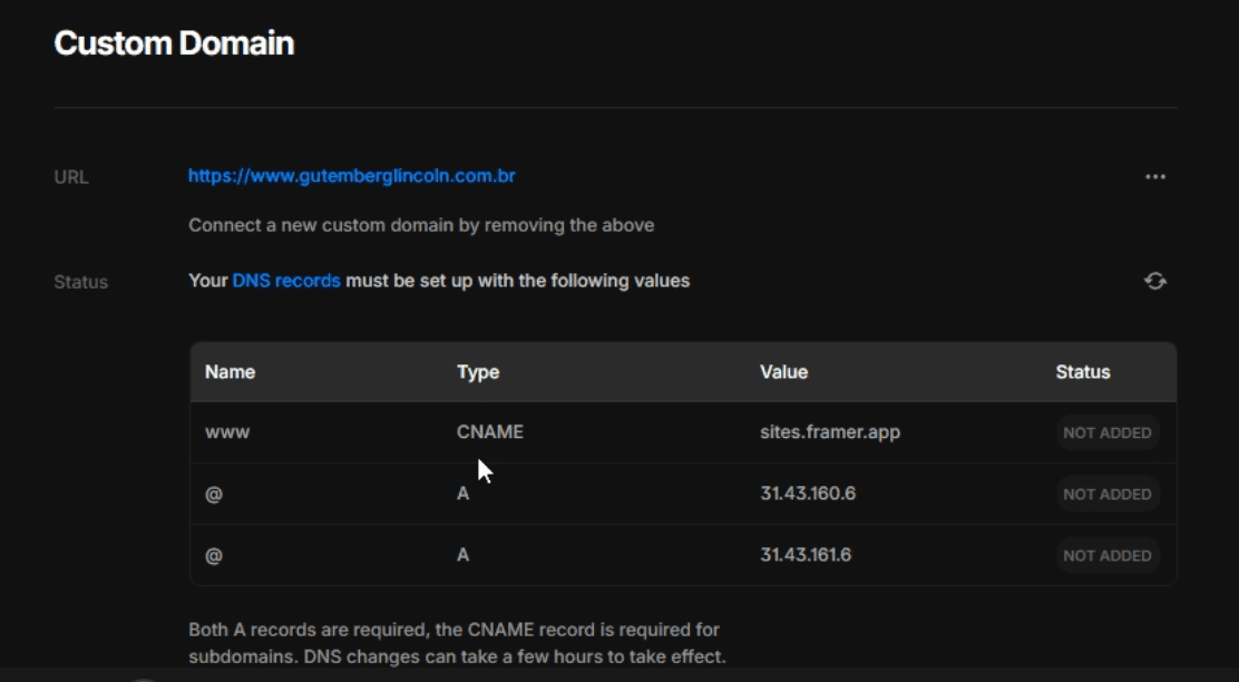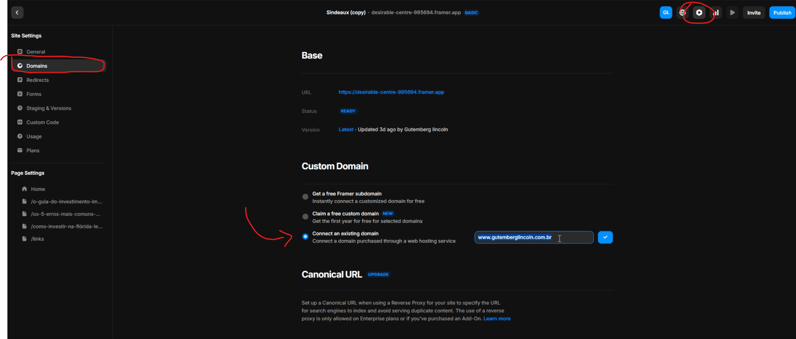 Volte para o framer clique na engrenagem para ir as configurações no menu superior direito. Depois vai em "Domains" do lado esquerdo e insira seu dominio em Custom domains